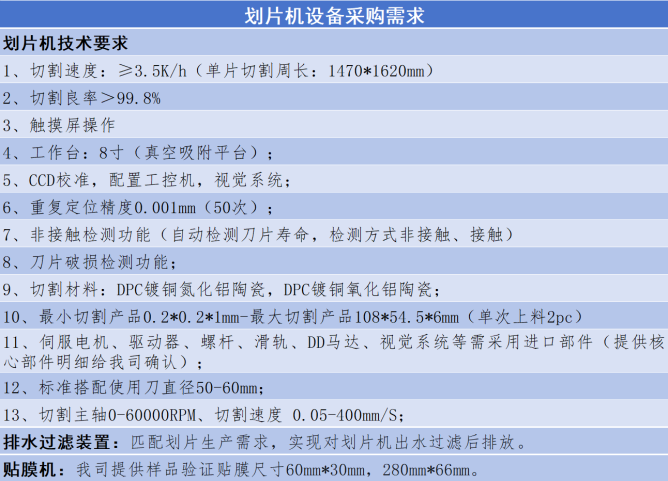 采購設(shè)備名稱:劃片機(jī)2臺(tái)(含附屬排水過濾裝置、貼膜機(jī))