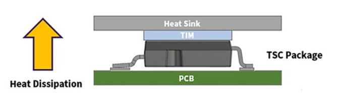另一方面,頂部散熱 (TSC) 器件通過封裝的上表面散熱。在頂部散熱 (TSC) 封裝內(nèi)部,芯片直接焊接在頂部漏極銅框架上,芯片通過封裝上表面導(dǎo)熱到上方的散熱器。相對于傳統(tǒng)底部散熱封裝,頂部散熱 (TSC) 封裝可以實現(xiàn)更大的耗散功率和更優(yōu)的散熱性能,助力客戶從容應(yīng)對系統(tǒng)熱設(shè)計要求。