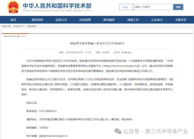 9月22日,中華人民共和國(guó)科學(xué)技術(shù)部官網(wǎng)發(fā)布《國(guó)家科學(xué)技術(shù)獎(jiǎng)勵(lì)工作辦公室公告第103號(hào)》。