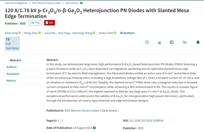 近日,西安電子科技大學(xué)研究團(tuán)隊(duì)在超寬禁帶半導(dǎo)體材料氧化鎵功率器件領(lǐng)域取得突破性進(jìn)展,相關(guān)成果于2025年8月14日以“120 A/1.78 kV p-Cr2O3/n-β-Ga2O3 Heterojunction PN Diodes with Slanted Mesa Edge Termination”為題在線發(fā)表于《IEEE Electron Device Letters》(DOI:10.1109/LED.2025.3598936)。該研究在國(guó)際上首次實(shí)現(xiàn)了百安千伏級(jí)高壓氧化鎵功率二極管,所制備的器件可承受120 A正向電流,同時(shí)反向擊穿電壓超過(guò)1700 V。本研究由西安電子科技大學(xué)郝躍院士團(tuán)隊(duì)張進(jìn)成教授、周弘教授領(lǐng)銜完成,張進(jìn)成教授與周弘教授為論文通訊作者,馮逸燾博士為第一作者。