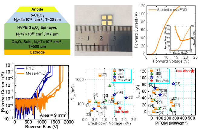 本研究采用高熱穩(wěn)定性的Cr2O3作為p型材料,和n型β-Ga2O3形成異質(zhì)結(jié),并協(xié)同斜臺(tái)面邊緣終端結(jié)構(gòu)優(yōu)化電場(chǎng)分布,制備了有源區(qū)面積為9 mm2的p-Cr2O3/n-β-Ga2O3 異質(zhì)結(jié)二極管。器件實(shí)現(xiàn)了120 A的正向電流和1780 V的擊穿電壓,同時(shí)具備69 mΩ的低導(dǎo)通電阻和0.511 GW/cm2的高功率優(yōu)值。該成果顯著推動(dòng)了氧化鎵材料在下一代高壓大功率工業(yè)電力電子中的應(yīng)用進(jìn)程。
