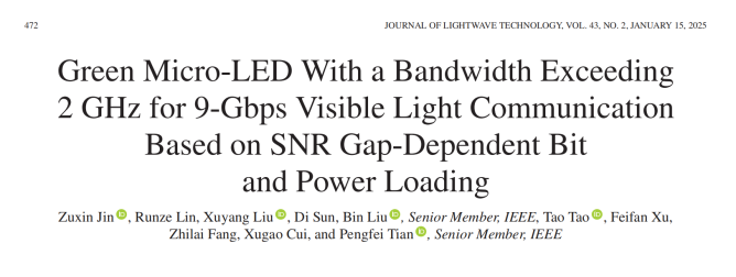 近期,復(fù)旦大學(xué)田朋飛課題組通過在藍(lán)寶石襯底上制備c-plane 綠光micro-LED,成功實(shí)現(xiàn)了高達(dá)2.19GHz的調(diào)制帶寬,并通過制備高光功率輸出的micro-LED串聯(lián)器件,結(jié)合正交頻分復(fù)用(Orthogonal Frequency Division Multiplexing, OFDM)技術(shù)和信噪比差額依賴的比特和功率加載算法(SNR Gap-Dependent Bit and Power Loading),實(shí)現(xiàn)了在自由空間0.2m傳輸距離條件下最高9.06Gbps的數(shù)據(jù)傳輸速率,相關(guān)成果以“Green Micro-LED With a Bandwidth Exceeding 2 GHz for 9-Gbps Visible Light Communication based on SNR Gap-Dependent Bit and Power Loading”為題發(fā)表于《Journal of Lightwave Technology》期刊上。