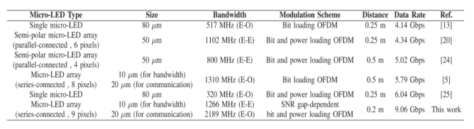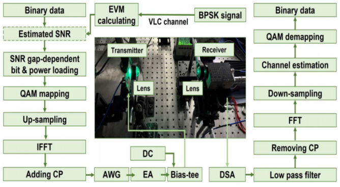 基于上述高性能micro-LED器件,通過信噪比差額依賴的比特和功率加載算法與OFDM調(diào)制技術(shù)相結(jié)合,該研究進(jìn)一步開展了自由空間中的VLC系統(tǒng)構(gòu)建以及通信速率研究工作,具體的實(shí)驗(yàn)裝置示意圖如圖2所示,數(shù)據(jù)傳輸速率達(dá)9.06Gbps,這是綠光micro-LED在自由空間中所能達(dá)到的最高數(shù)據(jù)傳輸速率。該工作一方面推動了高帶寬綠光micro-LED的發(fā)展,另一方面也證明了其在未來超高速無線光通信和光互連技術(shù)中的應(yīng)用前景。