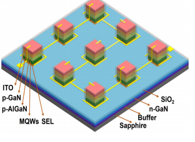 目前,micro-LED由于其高亮度、低功耗、高調(diào)制帶寬等優(yōu)點(diǎn),已經(jīng)逐漸被認(rèn)為是高速可見光通信(Visible light communication, VLC)和AI光互連系統(tǒng)中最有前景的研究方向之一。但之前的研究中,高速VLC主要基于藍(lán)光和紅光,傳統(tǒng)的c-plane綠光micro-LED由于受到“Green Gap”問題(高的In成分使得晶體質(zhì)量較差、極化電場較強(qiáng))的影響,高性能綠光器件的發(fā)展被限制,特別是在如何實(shí)現(xiàn)大規(guī)模、低成本的綠光micro-LED器件制備方面,相關(guān)問題仍亟待解決。