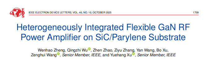 近日,電子科技大學(xué)微波毫米波集成電路團隊報道了一款基于碳化硅/聚對二甲苯(SiC/Parylene)襯底的異質(zhì)集成柔性氮化鎵(GaN)射頻功率放大器。該研究通過創(chuàng)新性地采用薄的SiC散熱層與柔性聚合物襯底相結(jié)合的策略,成功解決了柔性電子器件在高功率工作狀態(tài)下的熱管理難題,為實現(xiàn)高性能柔性射頻功率放大器(PA)提供了新的技術(shù)路徑。相關(guān)成果以《Heterogeneously Integrated Flexible GaN RF Power Amplifier on SiC/Parylene Substrate》為題,發(fā)表在《IEEE Electron Device Letters》上。電子科技大學(xué)徐躍杭教授為通訊作者,電子科技大學(xué)博士鄭文豪為文章一作。