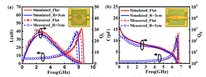 圖3: (a)柔性電感仿真和實測對比 (b)柔性電容仿真和實測對比