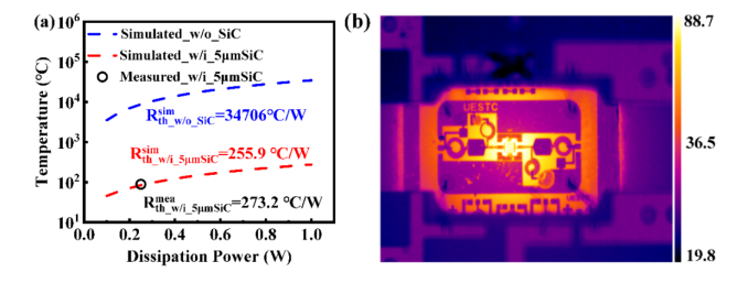 如圖4(a)所示,無SiC層的熱阻為34706°C/W,而含5μm SiC層的熱阻僅為255.9°C/W。如圖6(b)所示,紅外熱成像測量顯示,在0.25W功耗下最高溫度為88.7°C,對應(yīng)熱阻為273.2°C/W,略高于仿真值。