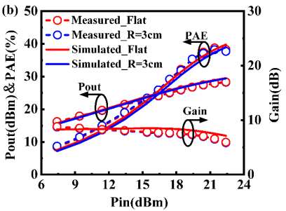 圖5:1.6 GHz頻率下,功率放大器在平坦狀態(tài)及彎曲狀態(tài)(彎曲半徑3 cm)時的仿真與實測性能對比。