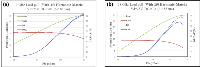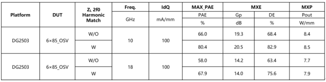 能訊于2025第一季度推出了最新的DG2503平臺,平臺在DC-18GHz頻段內(nèi)綜合性能出眾。該平臺采用0.25 ?m制程,以4吋SiC為襯底,減薄厚度為75 ?m,在28V應(yīng)用電壓條件下,其功率放大器(PA)的閾值電壓(Vth)為-2.8V,飽和電流(Imax)達1350 mA/mm,擊穿電壓超200V。PA在10GHz及18GHz兩個典型應(yīng)用頻點的射頻大信號性能如表一所示;圖一展示了10GHz、18GHz最大效率(MXE)匹配點的大信號功率掃描曲線,值得一提的是,加入二次諧波匹配后,10GHz及18GHz的功率附加效率(PAE)分別達到了80.4%和69.7%,在行業(yè)中展現(xiàn)了較強的競爭力。