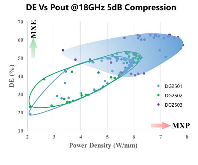 回顧歷史,能訊自2021年推出第一代0.25 ?m線寬的工藝平臺以來,平臺的射頻性能已經(jīng)歷多次迭代,以18GHz頻點28V應(yīng)用的性能為例,如圖二所示,在未進行二次諧波匹配的情況下,平臺PA漏極效率(DE)由50%提升至63%,同時,功率密度由6W/mm提升至7.7W/mm,提升幅度為28.3%,補充說明的是,這一過程中,其功率增益(Gp)也提升了2dB以上,從而實現(xiàn)了效率、功率密度、增益的全面提升。