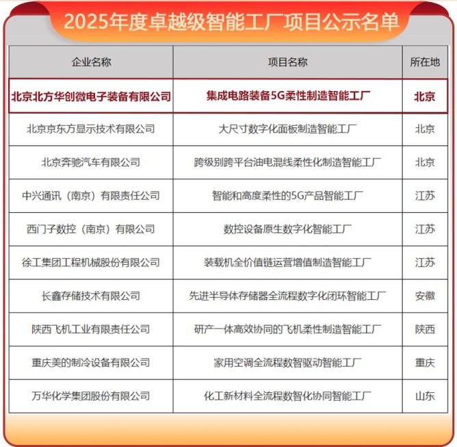 2025年9月4日,工業(yè)和信息化部發(fā)布《關(guān)于2025年度卓越級(jí)智能工廠項(xiàng)目的公示》。北京北方華創(chuàng)微電子裝備有限公司憑借在智能制造領(lǐng)域的卓越表現(xiàn),從全國參評企業(yè)中脫穎而出,成功入選2025年度卓越級(jí)智能工廠名單。卓越級(jí)智能工廠由工業(yè)和信息化部、國家發(fā)展改革委、財(cái)政部、國務(wù)院國資委、市場監(jiān)管總局、國家數(shù)據(jù)局共同評定。評選標(biāo)準(zhǔn)圍繞工廠建設(shè)、研發(fā)設(shè)計(jì)、生產(chǎn)作業(yè)、生產(chǎn)管理、運(yùn)營管理五個(gè)關(guān)鍵領(lǐng)域的15個(gè)智能場景和22項(xiàng)評價(jià)指標(biāo),對企業(yè)進(jìn)行全面系統(tǒng)的評價(jià)。通過專家打分和排名,確定最終獲獎(jiǎng)企業(yè)。