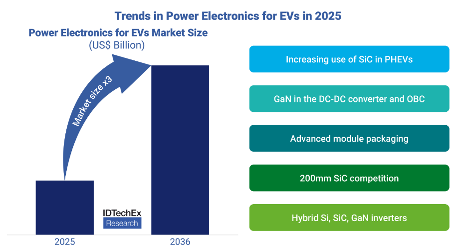 2025年是電力電子行業(yè)的轉(zhuǎn)折點。盡管電動汽車(EV)銷量放緩,但IDTechEx預測,到2036年,電動汽車電力電子市場的規(guī)模將增長兩倍,達到420億美元。
