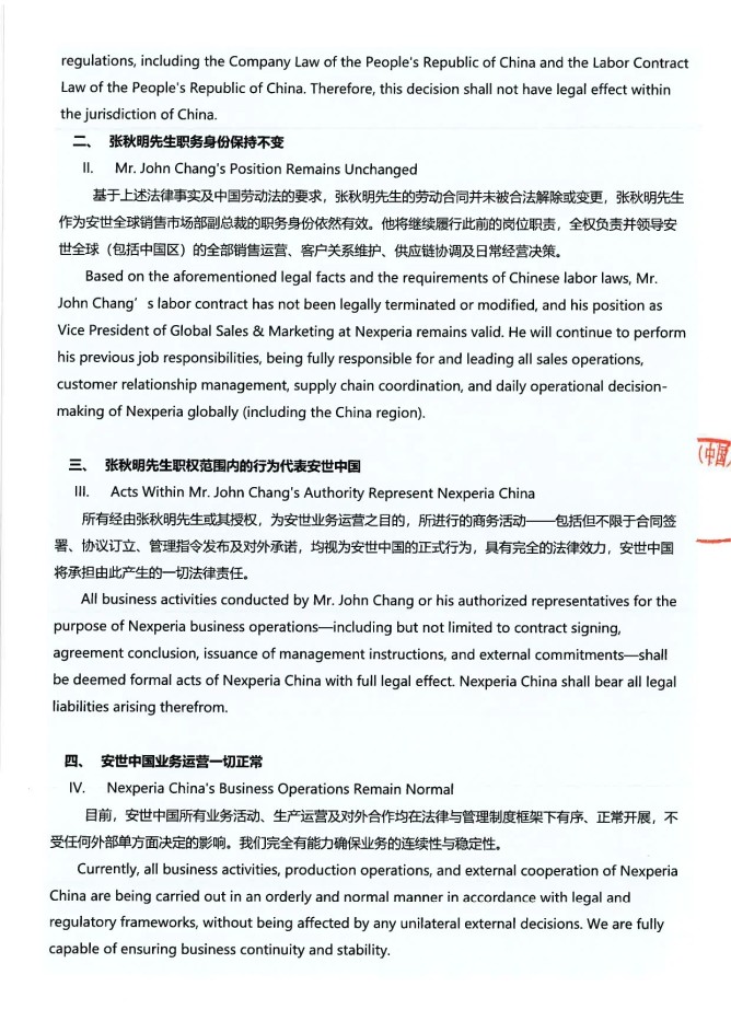 四、安世中國業(yè)務(wù)運營一切正常,目前,安世中國所有業(yè)務(wù)活動、生產(chǎn)運營及對外合作均在法律與管理制度框架下有序、正常開展,不受任何外部單方面決定的影響。我們完全有能力確保業(yè)務(wù)的連續(xù)性與穩(wěn)定性。