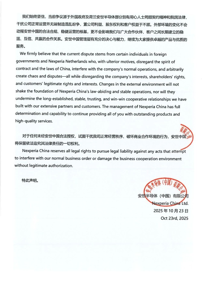 10月23日,安世半導體中國有限公司發(fā)布聲明稱,近期荷蘭總部單方面免去張秋明銷售市場部副總裁職務(wù)的決定,在中國法域下不發(fā)生法律效力。