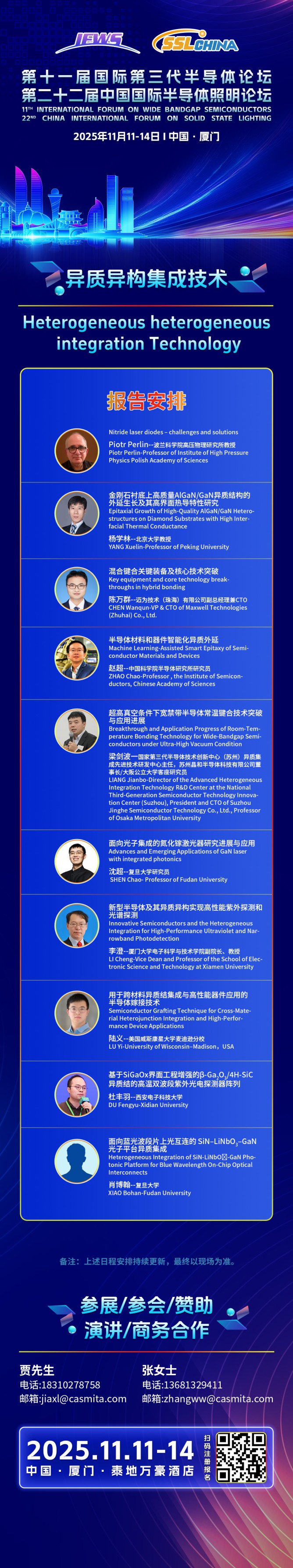 2025年11月11-14日,第十一屆國際第三代半導體論壇&第二十二屆中國國際半導體照明論壇(IFWS&SSLCHINA 2025)將在廈門召開。作為論壇重要分會,“異質(zhì)異構(gòu)集成大會”最新報告安排出爐。