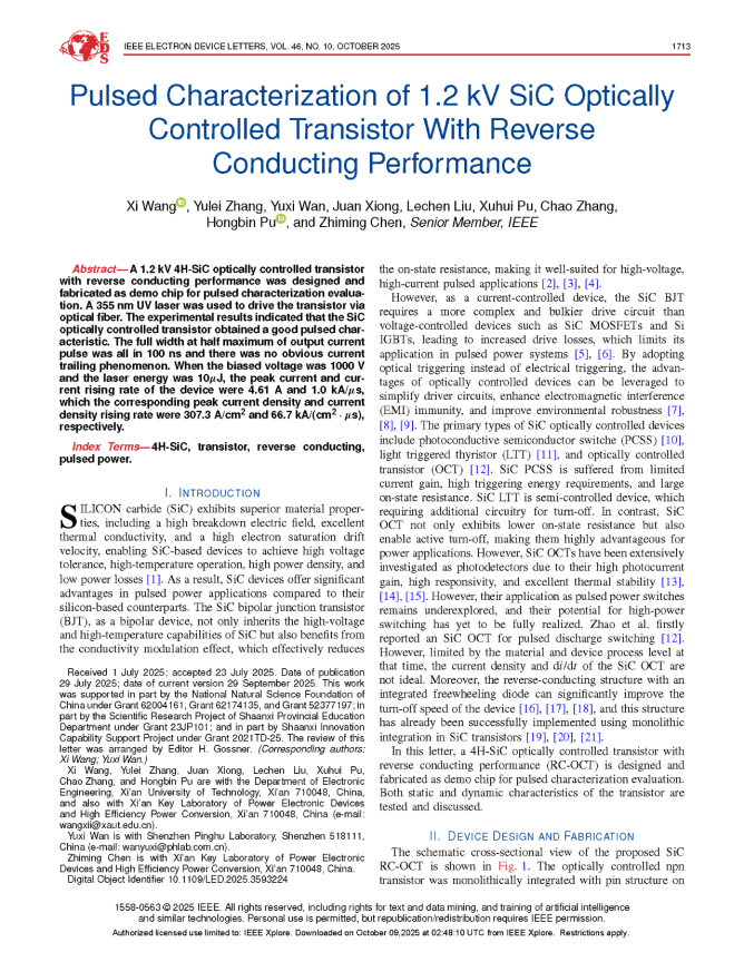 近期,深圳平湖實驗室與西安理工大學(xué)功率半導(dǎo)體器件及裝備創(chuàng)新團(tuán)隊聯(lián)合研究的最新成果在國際權(quán)威期刊 IEEE Electron Device Letters(EDL)上發(fā)表(doi: 10.1109/LED.2025.3593224),論文題為 “Pulsed Characterization of 1.2 kV SiC Optically Controlled Transistor With Reverse Conducting Performance”。該工作提出并制備了一種具備反向?qū)щ娞匦缘男滦?H-SiC光控晶體管(RC-OCT),實現(xiàn)了SiC光控器件在脈沖功率領(lǐng)域的創(chuàng)新性突破。