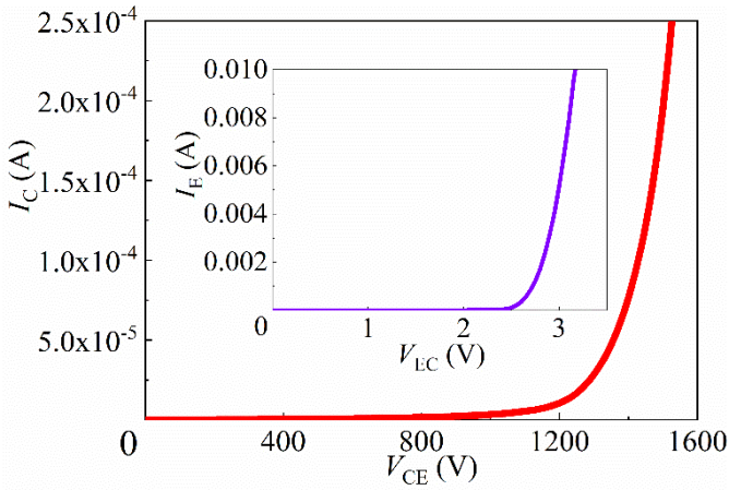 實驗結(jié)果顯示,所制備的SiC RC-OCT原型器件具有優(yōu)異的靜態(tài)特性及高速脈沖導(dǎo)通能力:正向阻斷電壓達(dá)1200 V、反向?qū)妷簝H2.8 V;在355 nm紫外激光觸發(fā)(能量10 μJ)下,器件實現(xiàn)峰值電流4.61 A、峰值電流密度307.3 A/cm²、電流上升速率1.0 kA/μs,對應(yīng)電流密度上升速率達(dá)66.7 kA/(cm²·μs)。