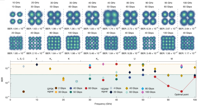 團隊的實驗驗證表明,該系統(tǒng)可實現(xiàn)>120 Gbps的超高速無線傳輸速率,滿足6G通信的峰值速率要求。尤為關鍵的是,得益于光電融合集成芯片的超寬帶特性,端到端無線通信鏈路在全頻段內展現(xiàn)出卓越的性能一致性,且高頻段性能未見劣化。這一突破性成果為6G通信高效開發(fā)太赫茲及乃至更高頻段的頻譜資源掃清了關鍵障礙。