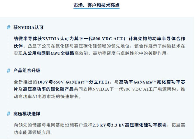 下一代GaNFast™氮化鎵與高壓碳化硅 (GeneSiC™) 功率半導體行業(yè)領導者——納微半導體 (納斯達克股票代碼: NVTS) 公布截至2025年9月30日的未經審計的第三季度財務業(yè)績。納微半導體總裁兼首席執(zhí)行官Chris Allexandre:“我非常榮幸在公司發(fā)展的關鍵時刻領導納微2.0團隊。隨著AI數(shù)據(jù)中心、高性能計算、能源與電網基礎設施及工業(yè)電氣化領域的高功率半導體需求迅速增長,納微半導體正迎來新的增長周期。納微半導體在氮化鎵 (GaN) 與高壓碳化硅 (SiC) 領域積累了十年以上的技術領先優(yōu)勢,使得納微能夠充分把握這些全球性增長趨勢。目前,納微正實施戰(zhàn)略轉型——從消費電子與移動市場,轉向增長更快、利潤更高、可持續(xù)性更強的高功率應用領域。通過迅速的資源重組、產品路線優(yōu)化以及市場策略調整,納微將實現(xiàn)業(yè)務質量與規(guī)模的雙重提升,為客戶、員工及股東創(chuàng)造長期價值。”
