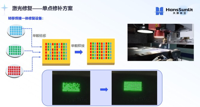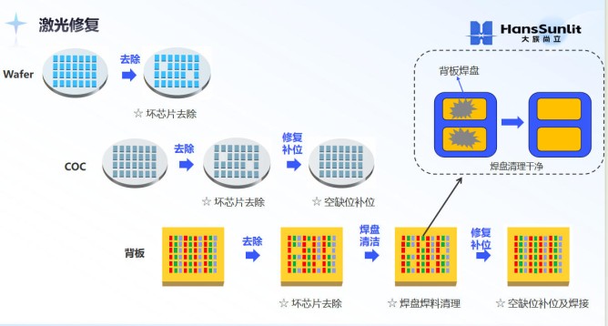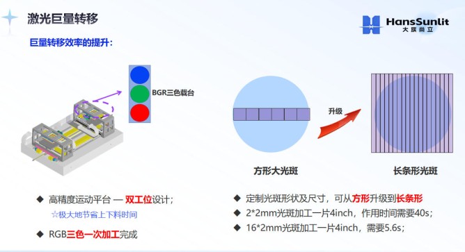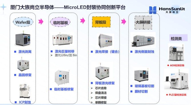 大族尚立深耕MicroLED行業(yè),逐步攻克激光巨量轉(zhuǎn)移、激光剝離、激光鍵合、激光修復(fù)等技術(shù)難題,開(kāi)發(fā)多臺(tái)國(guó)內(nèi)首臺(tái)設(shè)備,并實(shí)現(xiàn)全套設(shè)備銷售。報(bào)告中分享了大族尚立多款設(shè)備,以及其MicroLED封裝協(xié)同創(chuàng)新平臺(tái),該平臺(tái)可提供從晶圓到背板,全制程的MicroLED測(cè)試及加工一站式服務(wù)。