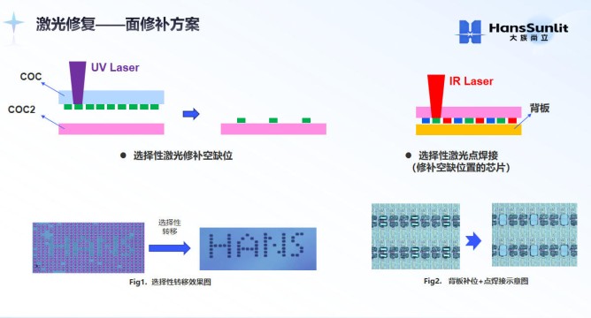 當(dāng)前,激光巨量轉(zhuǎn)移面臨著波長(zhǎng)一致性、轉(zhuǎn)移精度與良率、轉(zhuǎn)移效率等痛點(diǎn)難點(diǎn)。激光巨量焊接則面臨著上下基板熱失配問(wèn)題和大幅面焊接問(wèn)題。報(bào)告指出,波長(zhǎng)一致性可以采用分BIN/混BIN,將波長(zhǎng)相接近的芯片選擇在一起的解決辦法。陣列式光斑,激光精準(zhǔn)落于芯片之上,消除無(wú)效熱作用,徹底解決熱失配問(wèn)題。