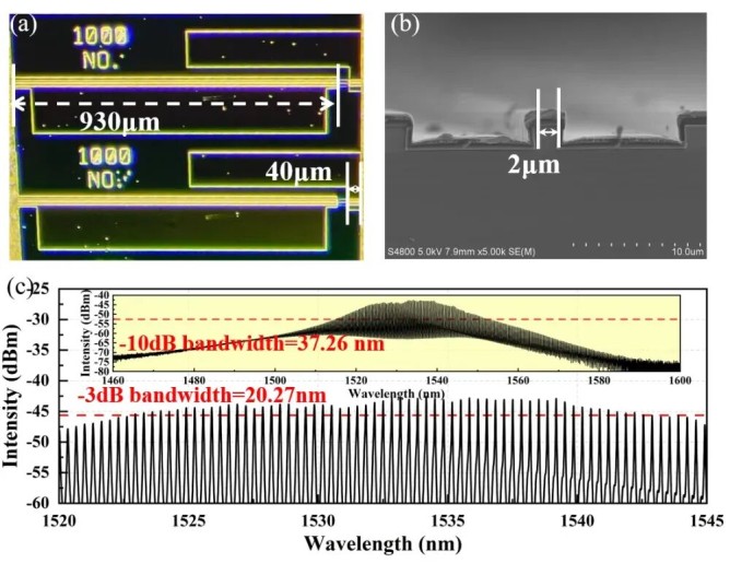 圖2. (a)兩段式被動(dòng)鎖模激光器光學(xué)顯微圖;(b)器件截面SEM圖;(c)出射光譜圖