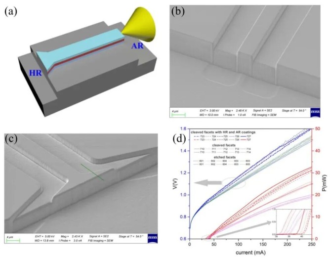 圖3. (a)干法刻蝕端面激光器結(jié)構(gòu)示意圖;(b)AR端面SEM圖;(c)HR端面SEM圖;(d)刻蝕端面激光器與自然解理激光器性能對(duì)比