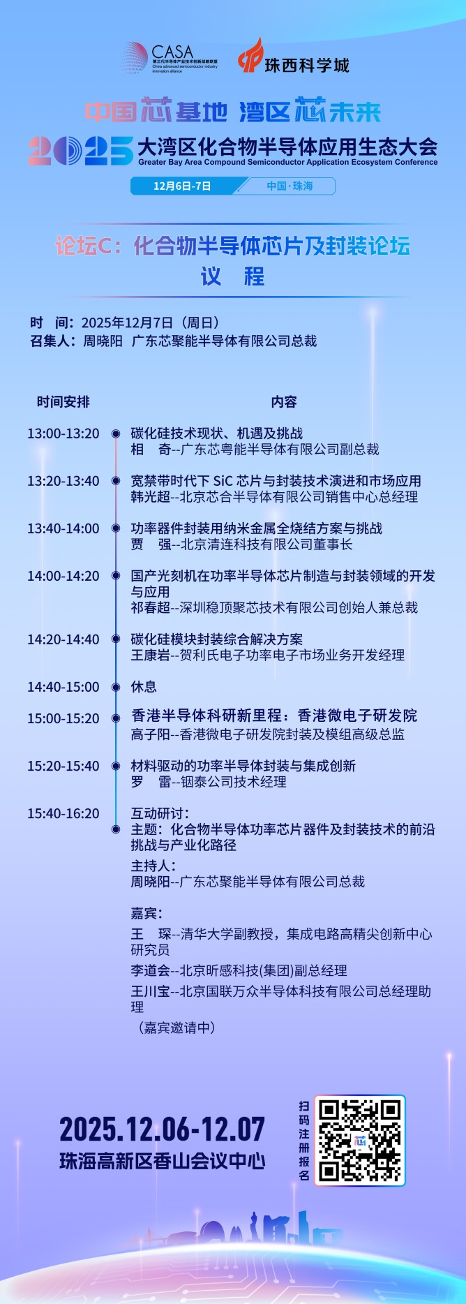 為緊抓化合物半導(dǎo)體產(chǎn)業(yè)爆發(fā)機(jī)遇,進(jìn)一步發(fā)揮珠海產(chǎn)業(yè)及應(yīng)用市場(chǎng)優(yōu)勢(shì),第三代半導(dǎo)體產(chǎn)業(yè)技術(shù)創(chuàng)新戰(zhàn)略聯(lián)盟(CASA)將于2025年12月6-7日在珠海高新區(qū)香山會(huì)議中心組織召開(kāi)首屆“大灣區(qū)化合物半導(dǎo)體應(yīng)用生態(tài)大會(huì)”。會(huì)議設(shè)有開(kāi)幕大會(huì)和化合物半導(dǎo)體材料論壇、化合物半導(dǎo)體功率器件與應(yīng)用論壇、化合物半導(dǎo)體芯片與封裝論壇、化合物半導(dǎo)體光電應(yīng)用創(chuàng)新論壇大會(huì)在內(nèi)四場(chǎng)平行論壇,將圍繞國(guó)家重大戰(zhàn)略和第三代半導(dǎo)體產(chǎn)業(yè)鏈發(fā)展需求,邀請(qǐng)重量級(jí)專家、學(xué)者及產(chǎn)業(yè)鏈重點(diǎn)企業(yè)代表深入探討上下游協(xié)同發(fā)展中的問(wèn)題,為新時(shí)期化合物半導(dǎo)體技術(shù)突破及產(chǎn)業(yè)發(fā)展戰(zhàn)略提供建議。