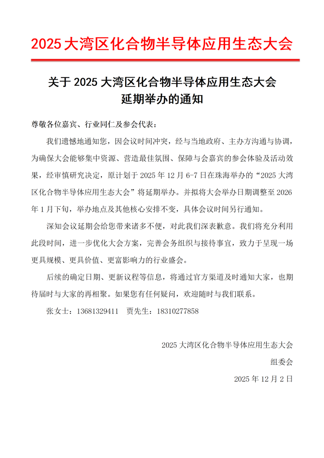 我們遺憾地通知您,因會議時間沖突,經(jīng)與當?shù)卣?、主辦方溝通與協(xié)調(diào),為確保大會能夠集中資源、營造最佳氛圍、保障與會嘉賓的參會體驗及活動效果,經(jīng)審慎研究決定,原計劃于2025年12月6-7日在珠海舉辦的“2025大灣區(qū)化合物半導體應(yīng)用生態(tài)大會”將延期舉辦。并擬將大會舉辦日期調(diào)整至2026年1月下旬,舉辦地點及其他核心安排不變,具體會議時間另行通知。