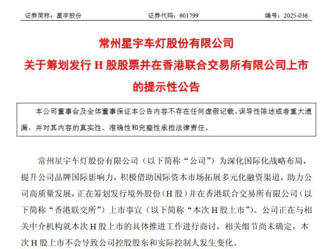 12月3日,星宇股份發(fā)布公告宣布,公司為深化國(guó)際化戰(zhàn)略布局,提升公司品牌國(guó)際影響力,積極借助國(guó)際資本市場(chǎng)拓展多元化融資渠道,助力公司高質(zhì)量發(fā)展,正在籌劃發(fā)行境外股份(H股)并在香港聯(lián)合交易所有限公司上市事宜。