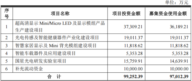 根據(jù)再融資招股書,國星光電計劃募資9.7億元投建超高清顯示 Mini/Micro LED 及顯示模組產(chǎn)品生產(chǎn)建設(shè)項目、光電傳感及智能健康器件產(chǎn)業(yè)化建設(shè)項目、智慧家居顯示及 Mini 背光模組建設(shè)項目、智能車載器件及應(yīng)用建設(shè)項目、國星光電研發(fā)實驗室項目及補充流動資金。