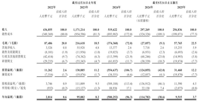 截至2025年5月31日止五個月,盡管公司的收入由2024年同期的2.97億元減少至2.57億元,但截至2025年5月31日止五個月,公司于2024年錄得的毛損及凈虧損狀態(tài)已轉(zhuǎn)為毛利及凈溢利狀態(tài),毛利為5776.5萬元。其中,公司截至2025年5月31日止五個月的凈利潤包括1500萬元的政府補(bǔ)助。