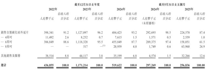 按具體產(chǎn)品線劃分,2022年、2023年、2024年及2025年前5個月,天域半導(dǎo)體絕大部分的收入來自銷售自制6英寸碳化硅外延片,其營收占比分別為88.6%、95.5%、87.7%及61.5%。自今年以來,天域半導(dǎo)體8英寸碳化硅外延產(chǎn)品開始規(guī)模供應(yīng),今年前五個月的收入為6396萬元,營收占比為24.9%。