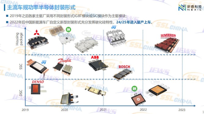 報告指出,碳化硅全價值鏈的研發(fā)制造過程,每個環(huán)節(jié)都有SiC自身特性需要逐步攻關,最終發(fā)揮SiC器件在功率半導體產(chǎn)業(yè)上的優(yōu)勢。從SiC全球產(chǎn)業(yè)鏈來看,中國企業(yè)近年在SiC襯底材料-外延生長端率先突破。SiC關鍵設備及Fab晶圓制造技術側(cè)尚有一定差距,國產(chǎn)芯片上主驅(qū)動可靠性方面需耐心。 功率器件在EV/HEV上的應用,主要應用在高功率Inverter, DC/DC和OBC等。IGBT和SiC的主驅(qū)應用,在后驅(qū)上使用SiC獲得最優(yōu)的性能,兼顧成本前驅(qū)上使用IGBT;在OBC和DC/DC以及換電站上均采用SiC。應用SiC器件主驅(qū)具有效率提升,里程提升,降低能源損耗等優(yōu)勢。 從主流車規(guī)功率半導體封裝形式來看,2019年之后各家主驅(qū)廠采用不同封裝形式IGBT模塊或SiC模塊作為主驅(qū)模塊; 2022年后中國新能源車廠自定義新型封裝形式充分發(fā)揮碳化硅特性,近兩年進入量產(chǎn)上車。