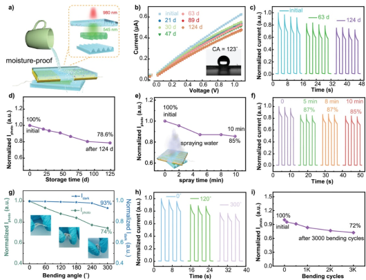 在本研究中,吉林大學李順心課題組構建的光電探測器通過“光轉(zhuǎn)換–光捕獲–光電轉(zhuǎn)換”的三重協(xié)同效應,實現(xiàn)了鈣鈦礦光電探測器在近紅外波段的高性能探測與優(yōu)異穩(wěn)定性。其中,UCNP負責將980 nm近紅外光上轉(zhuǎn)換為可見光,雙納米光柵結構進一步增強光吸收,PDMS封裝則顯著提升環(huán)境與機械穩(wěn)定性。基于該策略,器件在980 nm條件下實現(xiàn)了2.9 A·W?¹的響應度和1.34×10¹¹ Jones 的探測率,并在空氣中存放4個月及經(jīng)歷3000次彎折后分別保持78.6 %與72.4 %的性能,為柔性近紅外傳感與多功能光電集成系統(tǒng)的發(fā)展提供了可行路徑。