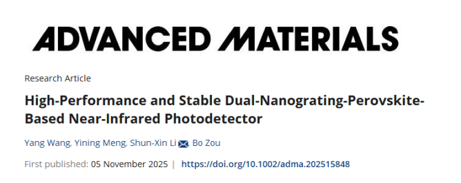 近日,吉林大學物理學院李順心副教授等人在高性能近紅外光電探測器方面取得重要突破。研究團隊創(chuàng)新性地提出了一種雙納米光柵結構與上轉(zhuǎn)換納米顆粒(UCNP,NaYF4 : 20 %Yb, 2 %Er)相結合的策略,以增強MAPbBr3的穩(wěn)定性,并將其光譜響應范圍擴展至近紅外區(qū)域。雙納米光柵結構不僅增強了光捕獲能力,還通過原位封裝提升了器件的環(huán)境穩(wěn)定性與機械柔性。相關研究成果以“High-Performance and Stable Dual-Nanograting-Perovskite-based Near-Infrared Photodetector”為題發(fā)表在《Advanced Materials》期刊上。