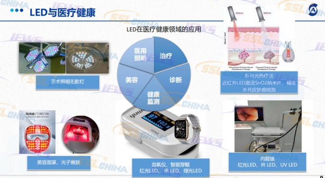 LED在醫(yī)療健康領(lǐng)域的應(yīng)用涉及醫(yī)用照明、治療、診斷、美容、健康監(jiān)測(cè)等,報(bào)告顯示,全球光療燈市場(chǎng)預(yù)測(cè)年均復(fù)合增長(zhǎng)率5.35%,將在2029年達(dá)到37.87億元人民幣。其中中國(guó)光療燈市場(chǎng)約占全球市場(chǎng)份額的30%。未來(lái)面臨的挑戰(zhàn)與未來(lái)發(fā)展方向,涉及可穿戴、可植入性,智能化、診療一體化,LED光效提升、材料結(jié)構(gòu)創(chuàng)新等。