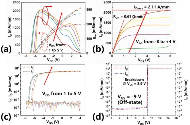 研究團(tuán)隊(duì)通過將源漏極歐姆接觸區(qū)域延伸至柵極邊緣,并采用n??-GaN二次外延技術(shù),有效抑制了常規(guī)器件中由非柵控2DEG區(qū)域引入的接入?yún)^(qū)電阻,進(jìn)而顯著提升了器件的輸出特性。該器件在550 nm柵長(zhǎng)下,實(shí)現(xiàn)了2.11 A/mm的飽和電流密度、300 mS/mm的峰值跨導(dǎo)以及0.61 Ω·mm的低導(dǎo)通電阻,歐姆接觸電阻低至0.09 Ω·mm。