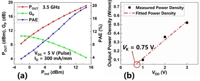 在3.5 GHz頻段的負(fù)載牽引測(cè)試中,器件在5 V漏極電壓下輸出功率密度達(dá)0.81 W/mm,線性增益10.5 dB,峰值功率附加效率(PAE)為19.4%。尤為值得關(guān)注的是,在射頻功率應(yīng)用場(chǎng)景下,通過線性外推法提取得到器件的膝點(diǎn)電壓僅0.75 V,是目前已公開報(bào)道的低壓GaN射頻器件中的最優(yōu)值。下一步將通過選區(qū)生長(zhǎng)高阻GaN、抬升T柵等方面的研究,進(jìn)一步提升器件性能。