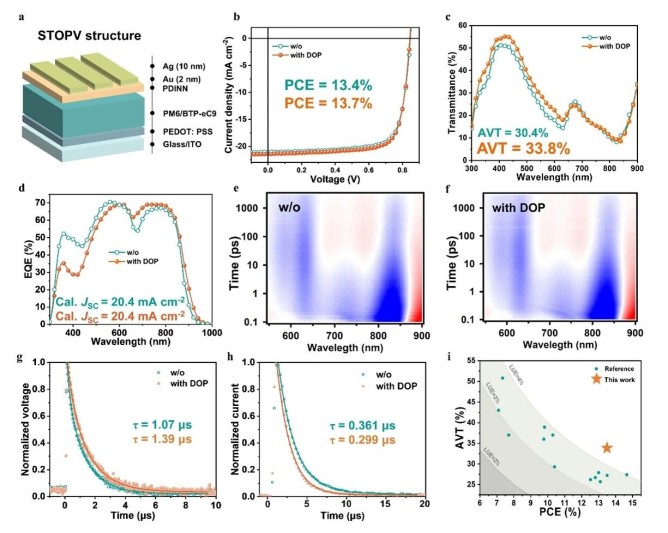 有序性的提升為器件性能帶來(lái)了明顯的提高。在有機(jī)場(chǎng)效應(yīng)晶體管中,DOP處理將基于PM6的器件的平均空穴遷移率從0.15 cm2 V−1 s−1提升至0.20 cm2 V−1 s−1,增幅達(dá)33.3%。在應(yīng)用前景廣闊的半透明有機(jī)太陽(yáng)能電池中,該策略展現(xiàn)出獨(dú)特優(yōu)勢(shì):器件在維持13.7%光電轉(zhuǎn)換效率的同時(shí),平均可見(jiàn)光透過(guò)率由30.4%提升至33.8%。這主要?dú)w因于更有序的分子堆積導(dǎo)致吸收光譜半高寬收窄、吸收拖尾減弱,使得器件在視覺(jué)上更透明。進(jìn)一步的器件物理分析表明,器件吸光變少但光電流基本不變?cè)从陔p分子復(fù)合受到抑制、電荷載流子壽命延長(zhǎng)以及電荷提取能力的增強(qiáng)。最終,電池獲得了高達(dá)4.63%的光利用效率,為目前無(wú)光學(xué)結(jié)構(gòu)半透明有機(jī)太陽(yáng)能電池的最高值之一。該工作不僅提出了一種簡(jiǎn)單、通用且高效的新方法抑制有機(jī)半導(dǎo)體的能量無(wú)序,還從分子相互作用的層面深化了對(duì)有機(jī)半導(dǎo)體聚集行為的理解,為制備高性能有機(jī)電子器件開(kāi)辟了新途徑。
