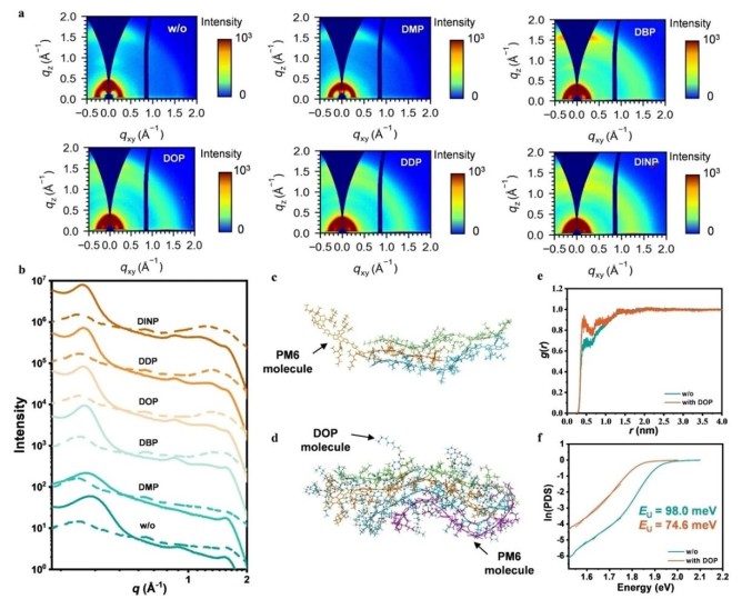 研究團(tuán)隊(duì)開(kāi)發(fā)了一系列鄰苯二甲酸酯類的組裝誘導(dǎo)劑,發(fā)現(xiàn)組裝誘導(dǎo)劑在多種p型有機(jī)聚合物半導(dǎo)體中均存在一定的普適性,并通過(guò)多種表征手段,從分子到器件層面系統(tǒng)研究了組裝誘導(dǎo)劑的作用機(jī)理。以組裝誘導(dǎo)劑鄰苯二甲酸二辛酯(DOP)和p型有機(jī)聚合物半導(dǎo)體PM6為例,紫外-可見(jiàn)吸收光譜表明,經(jīng)DOP處理后,PM6薄膜的0-0/0-1峰強(qiáng)度比提升,吸收半高寬收窄11%,吸收拖尾被顯著抑制,這一定程度上表明了分子排列有序度的提高。掠入射廣角X射線散射結(jié)果表明,組裝誘導(dǎo)劑顯著增強(qiáng)了PM6聚合物的層狀堆積和π-π堆疊有序性,相干長(zhǎng)度大幅增加。分子動(dòng)力學(xué)模擬進(jìn)一步揭示,DOP分子分布于PM6堆積簇周圍,通過(guò)與側(cè)鏈相互作用,誘導(dǎo)分子骨架形成更具序性的長(zhǎng)程排列。光熱偏轉(zhuǎn)光譜證明,經(jīng)過(guò)DOP處理后,PM6薄膜的烏爾巴赫能從98.0 meV顯著降低至74.6 meV,降低了24%,標(biāo)志著能量無(wú)序性得到了有效抑制。
