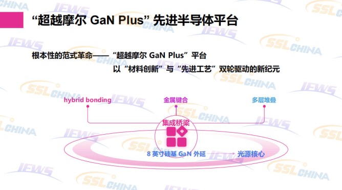 報(bào)告顯示,“超越摩爾 GaN Plus”先進(jìn)半導(dǎo)體平臺(tái)以“材料創(chuàng)新”與“先進(jìn)工藝”雙輪驅(qū)動(dòng),構(gòu)建半導(dǎo)體技術(shù)新紀(jì)元。其核心架構(gòu)圍繞“集成橋梁”與“光源核心”展開(kāi),通過(guò)hybrid bonding(混合鍵合)、金屬鍵合、多層堆疊等先進(jìn)工藝,結(jié)合8英寸硅基GaN外延技術(shù),實(shí)現(xiàn)半導(dǎo)體器件的高效集成與性能突破。該平臺(tái)聚焦材料與工藝協(xié)同創(chuàng)新,為MicroLED、功率器件等前沿領(lǐng)域提供底層技術(shù)支撐,推動(dòng)半導(dǎo)體產(chǎn)業(yè)向更高集成度、更低功耗方向發(fā)展。