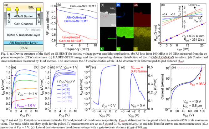 為攻克這一難題,研究團(tuán)隊(duì)聚焦于硅基氮化鎵(GaN-on-Si)技術(shù)路線,通過(guò)電路設(shè)計(jì)與半導(dǎo)體工藝的協(xié)同創(chuàng)新,成功開(kāi)發(fā)出面向手機(jī)低壓應(yīng)用場(chǎng)景的射頻氮化鎵高遷移率電子晶體管(GaN HEMT)技術(shù),并率先在手機(jī)平臺(tái)上完成了系統(tǒng)級(jí)性能驗(yàn)證,為6G時(shí)代終端射頻架構(gòu)的演進(jìn)奠定了關(guān)鍵技術(shù)基礎(chǔ)。