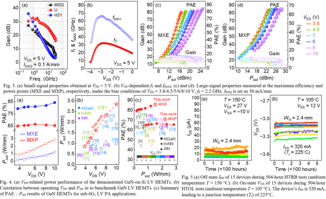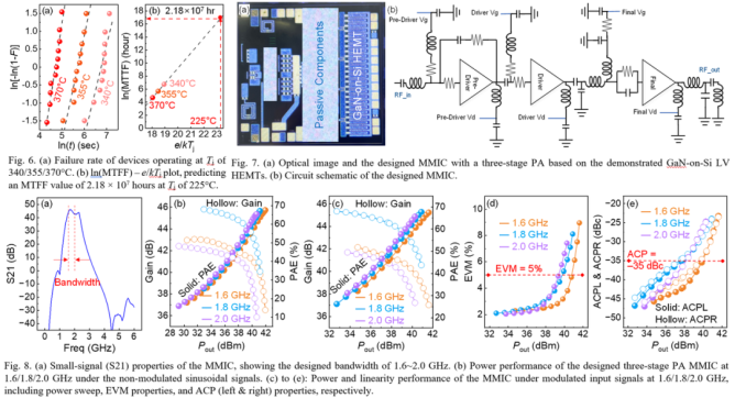 相較于傳統(tǒng)的 GaAs 基功率放大器,在保持相當(dāng)線度性的同時(shí),研究團(tuán)隊(duì)開(kāi)發(fā)的低壓氮化鎵功放展現(xiàn)出顯著的性能優(yōu)勢(shì)。最終,該器件實(shí)現(xiàn)了比上一代更高的功率附加效率(PAE),并同時(shí)兼顧通信系統(tǒng)的線性度和功率等級(jí)要求,在系統(tǒng)級(jí)指標(biāo)上達(dá)成重要突破。