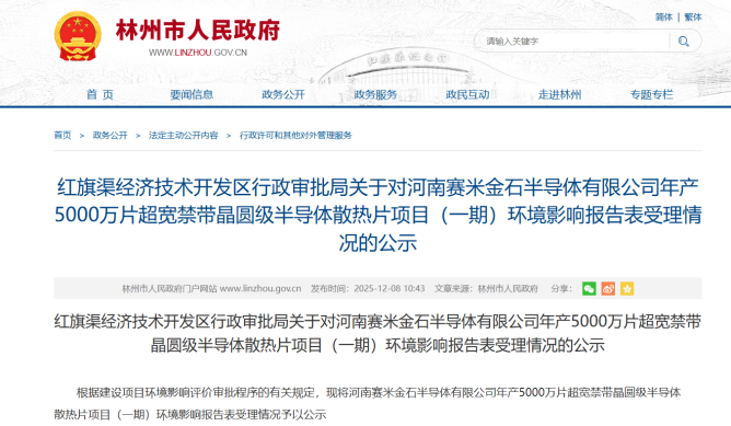 近日,林州市人民政府對河南賽米金石半導體有限公司年產(chǎn)5000萬片超寬禁帶晶圓級半導體散熱片項目(一期)環(huán)境影響報告表受理情況進行公示。