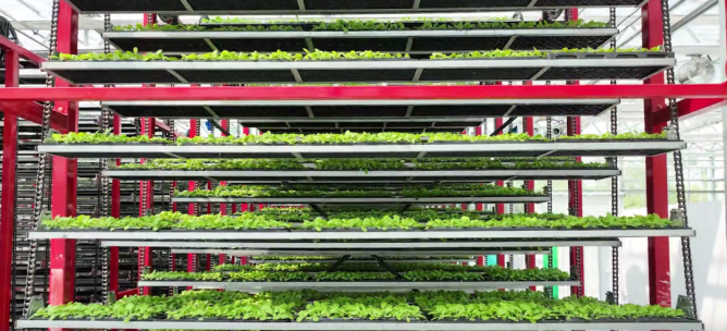 其中,立體多層育苗區(qū)配備了12臺(tái)高達(dá)5米的循環(huán)運(yùn)動(dòng)式育苗機(jī),單臺(tái)即可承載2025個(gè)育苗盤(pán),配合智能傳感與灌溉系統(tǒng),單次育苗能力可滿足800~1000畝農(nóng)田需求,效率達(dá)到傳統(tǒng)模式的4至5倍。