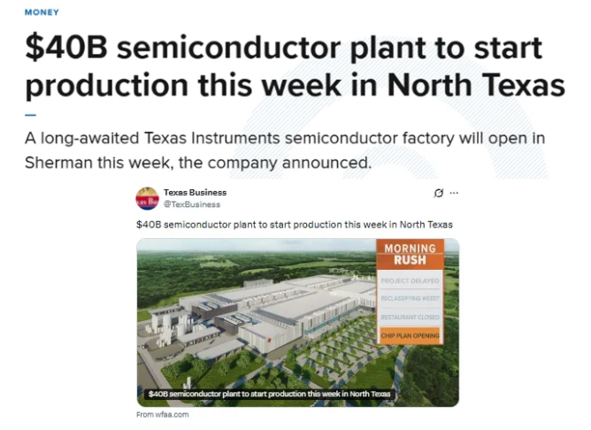 近日,德州儀器公司(Texas Instruments)對(duì)外宣布,其斥資400億美元建設(shè)的半導(dǎo)體工廠將于本周在得克薩斯州謝爾曼市投入運(yùn)營(yíng)。