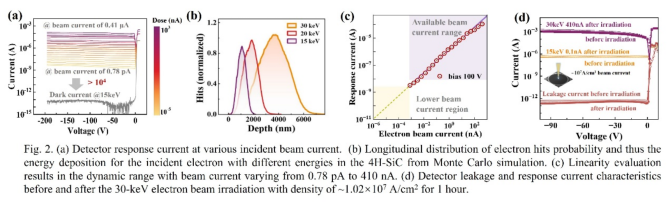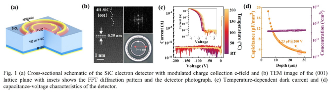 團(tuán)隊(duì)基于厚膜外延SiC材料提出并發(fā)展了具有等電勢(shì)保護(hù)環(huán)結(jié)構(gòu)的新型電子探測(cè)器,利用該保護(hù)環(huán)結(jié)構(gòu)實(shí)現(xiàn)了對(duì)探測(cè)靈敏區(qū)域邊緣尖峰電場(chǎng)的充分抑制,以及對(duì)非靈區(qū)域噪聲電荷的有效屏蔽。同時(shí),得益于寬禁帶半導(dǎo)體低熱載流子產(chǎn)生率、優(yōu)異的溫度穩(wěn)定性,該探測(cè)器暗電流在200°C芯片溫度下仍然保持在皮安以下,并實(shí)現(xiàn)了近100%的電荷收集效率。