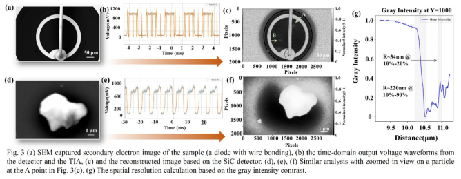 此外,SiC探測(cè)器還表現(xiàn)出優(yōu)異的抗輻照特性,在極端1GeV重離子輻照和107 A/cm² @ 30 keV極端聚焦電子束流輻照下,探測(cè)器暗電流和響應(yīng)特性幾乎零退化。團(tuán)隊(duì)還進(jìn)一步與合作單位一起搭建了散射電子顯微系統(tǒng),并優(yōu)化了基于時(shí)域電子響應(yīng)電流的二維圖像重構(gòu)算法,初期實(shí)現(xiàn)了34nm的空間分辨率。值得指出的是,該電子顯微圖像相較于二次電子圖像,具有更優(yōu)異的表面成分分辨能力。