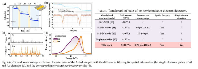 進(jìn)一步的,團(tuán)隊(duì)基于自身在低噪聲光電信號(hào)處理芯片領(lǐng)域的優(yōu)勢(shì)技術(shù)積累,發(fā)展了具有電子能量、時(shí)間信號(hào)解耦分析能力的專用電子學(xué)芯片,實(shí)現(xiàn)了單電子精密測(cè)量,時(shí)間分辨率達(dá)到6.6ns。所提取的單電子能量和時(shí)間信息表現(xiàn)出與樣品形貌、成分的直接關(guān)聯(lián)關(guān)系,實(shí)現(xiàn)了對(duì)目標(biāo)樣品的單電子級(jí)分辨與顯微。